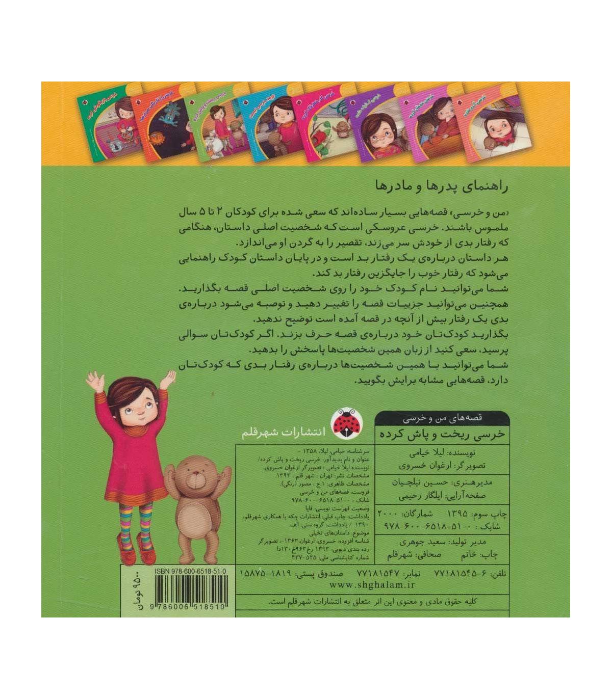 راهنمای پدرها و مادرها «من و خرسی» قصه هایی بسیار ساده اند که سعی شده برای کودکان 2 تا 5 ساله ملموس باشند. خرسی عروسکی است که شخصیت اصلی داستان، هنگامی که رفتار بدی از خودش سر می زند، تقصیر را به گردن او می اندازد. هر داستان درباره یک رفتار بد است و در پایان داستان کودک راهنمایی می شود که رفتار خوب را جایگزین رفتار بد کند. شما می توانید نام کودک خود را روی شخصیت اصلی قصه بگذارید. همچنین می توانید جزییات قصه را تغییر دهید و جزییاتی که برای کودک خودتان آشناست، جایگزین کنید. توصیه می شود درباره بدی یک رفتار بیش از آنچه در قصه آمده است توضیح ندهید. بگذارید کودکتان خود درباره قصه حرف بزند، اگر کودکتان سوالی پرسید، سعی کنید از زبان همین شخصیت ها پاسخش را بدهید. شما می توانید با همین شخصیت ها درباره رفتار بدی که کودکتان دارد، قصه هایی مشابه برایش بگویید.
