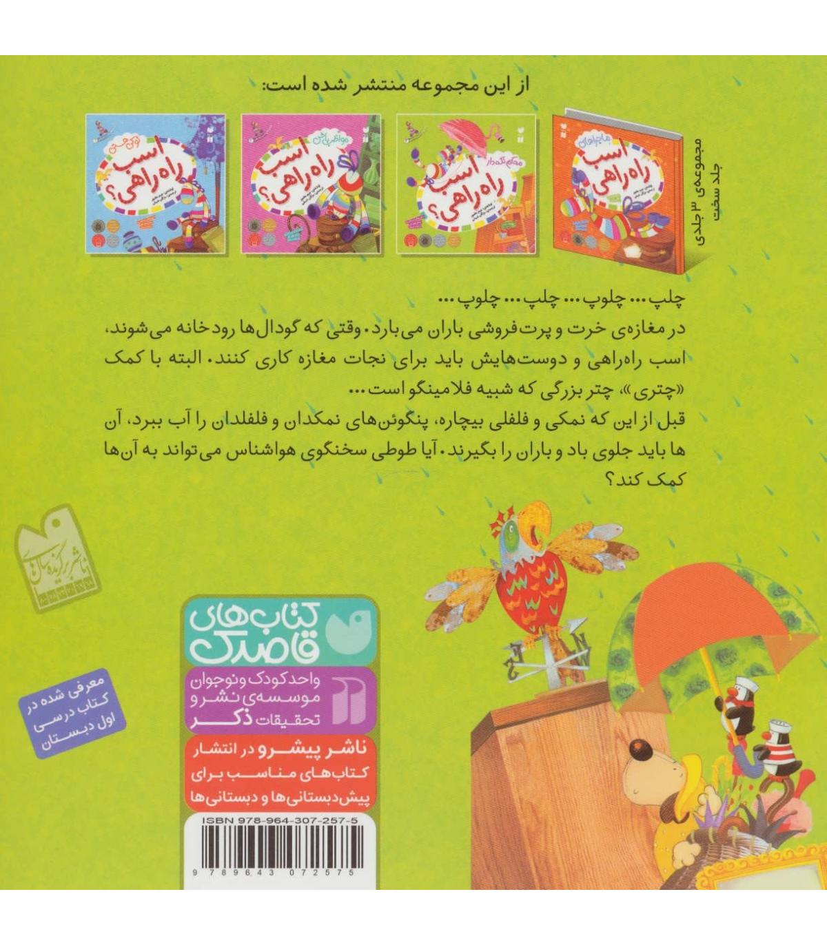 چلپ...چلوپ...چلپ...چلوپ... در مغازه خرت و پرت فروشی باران می بارد. وقتی که گودال ها رودخانه می شوند اسب راه راهی و دوست هایش باید برای نجات مغازه کاری کنند.البته با کمک«چتری»چتر بزرگی که شبیه فلامینگو است... قبل از این که نمکی و فلفلی بیچاره پنگوئن های نمک دان و فلفل دان را آب ببرد آن ها باید جلوی باد و باران را بگیرند.آیا طوطی سخنگوی هواشناس می تواند به آن ها کمک کند؟