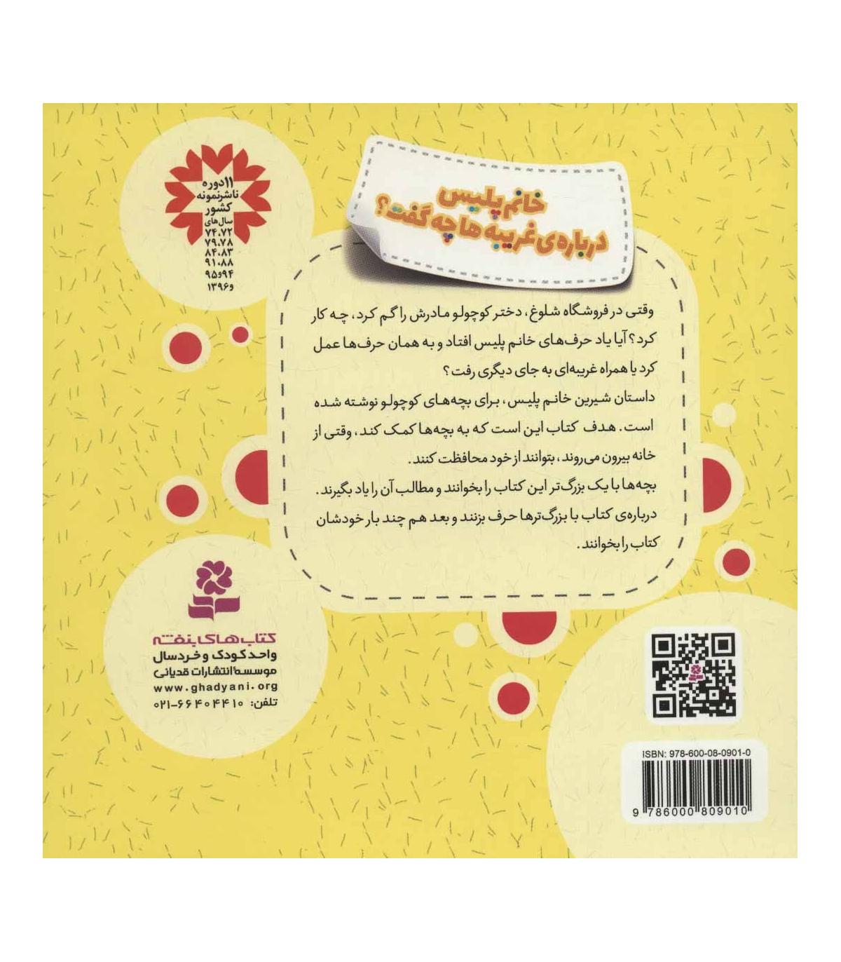 وقتی در فروشگاه شلوغ، دختر کوچولو مادرش را گم کرد، چه کار کرد؟ آیا یاد حرف های خانم پلیس افتاد و به همان حرف ها عمل کرد یا همراه غریبه ای به جای دیگری رفت؟ داستان شیرین خانم پلیس، برای بچه های کوچولو نوشته شده است. هدف کتاب این است که به بچه ها کمک کند، وقتی از خانه بیرون می روند، بتوانند از خود محافظت کنند. بچه ها با یک بزرگ تر این کتاب را بخوانند و مطالب آن را یاد بگیرند. درباره ی کتاب با بزرگترها حرف بزنند و بعد هم چند بار خودشان کتاب را بخوانند.