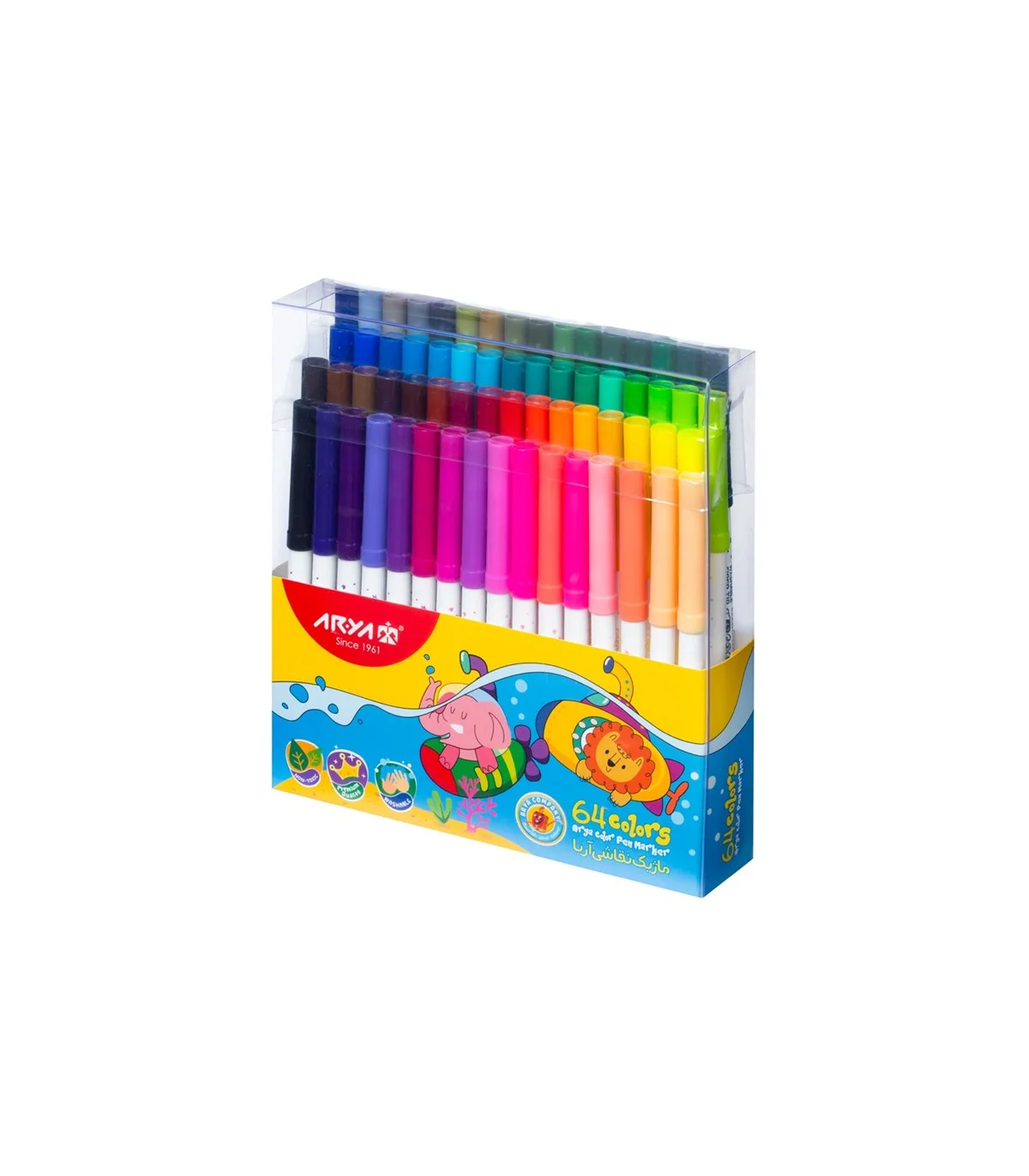 ماژیک 64 رنگ آریا با جعبه طلقی، مناسب برای طراحی و رنگ آمیزی با کیفیت بالا. نوک الیاف پلی استر، مناسب برای کاغذ و سطوح مختلف. خرید از فروشگاه شازده کوچولو.
