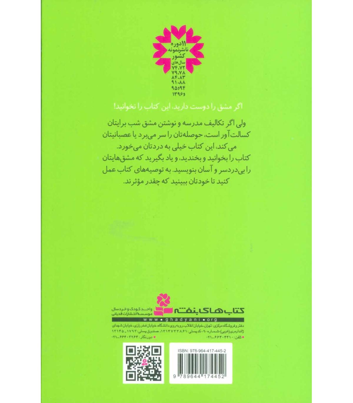 اين كتاب حاوي دهها نكته تجربي و كاربردي است كه براي مقابله با مشكل "مشق شب" ميتوان از آنها بهره برد. اين مطالب به ويژه براي دانشآموزان مفيد است كه مشق شب را عذابي بزرگ ميدانند و به شيوههاي مختلف از زير بار آن شانه خالي ميكنند. مطالعه اين كتاب به همه مربيان، والدين و دانشآموزان توصيه شده است.